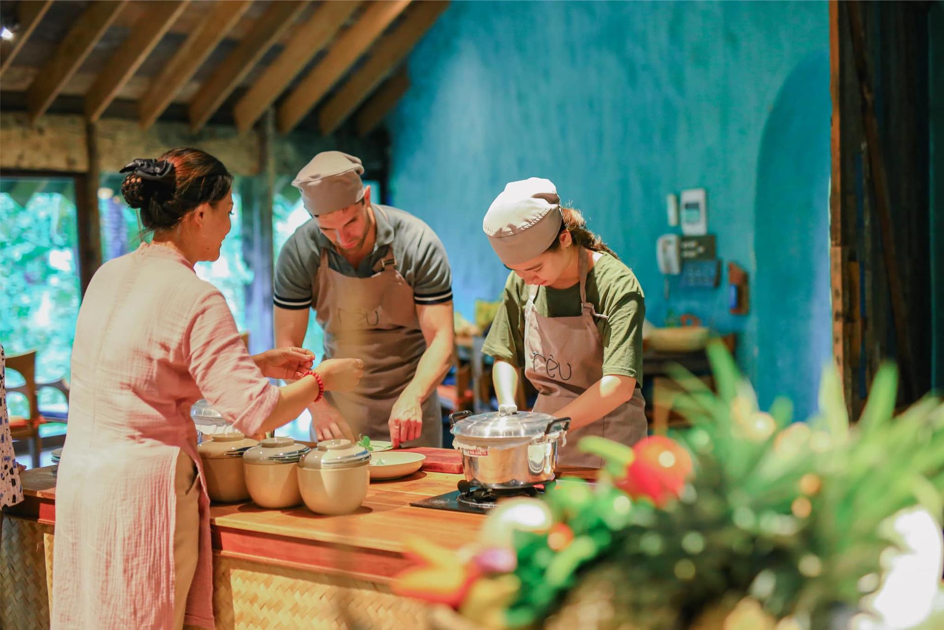 Durante la clase de cocina "Spirit of Rêu", aprenderá a preparar platos locales especiales y adquirirá una sólida comprensión de los ingredientes y sabores que se utilizan en la cocina vietnamita. También podrá degustar platos especiales locales que quizás aún no haya probado. Al final de la clase de cocina, se sentará con amigos y disfrutará de un delicioso almuerzo preparado por ustedes mismos.